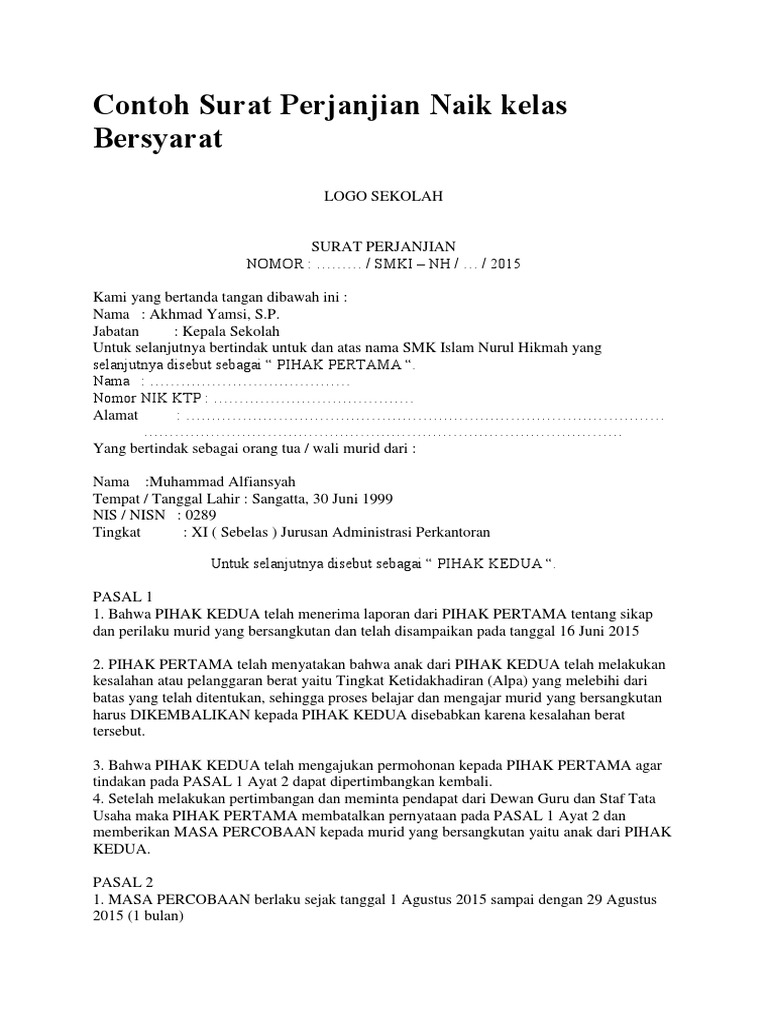Contoh Surat Perjanjian Naik Kelas Bersyarat