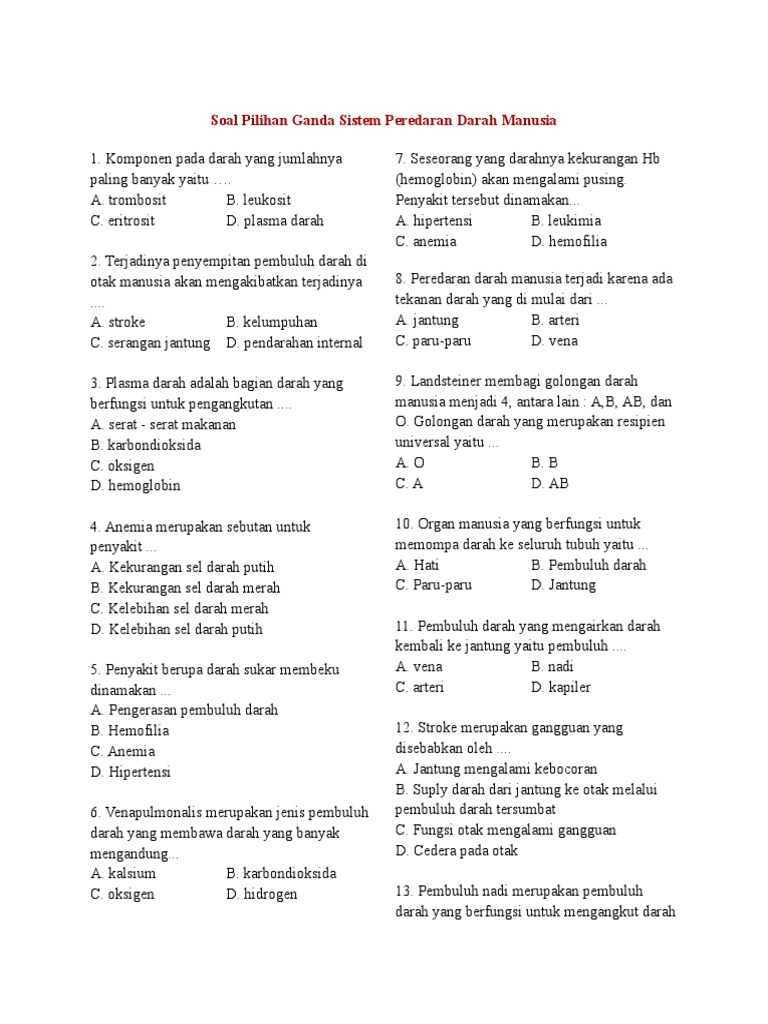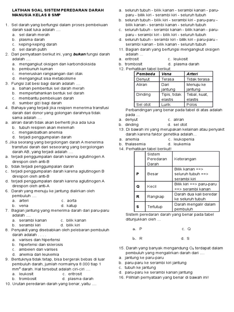 Penting untuk pengikatan dan pengankutan oxygen b. Home Soal Latihan Biologi LATIHAN SOAL SISTEM PEREDARAN DARAH MANUSIA KELAS 8 SMP LATIHAN SOAL SISTEM PEREDARAN DARAH MANUSIA KELAS 8 SMP Written By The Dreamer on Wednesday 11 1. LATIHAN SOAL SISTEM PEREDARAN DARAH MANUSIA KELAS 8 SMP 1.